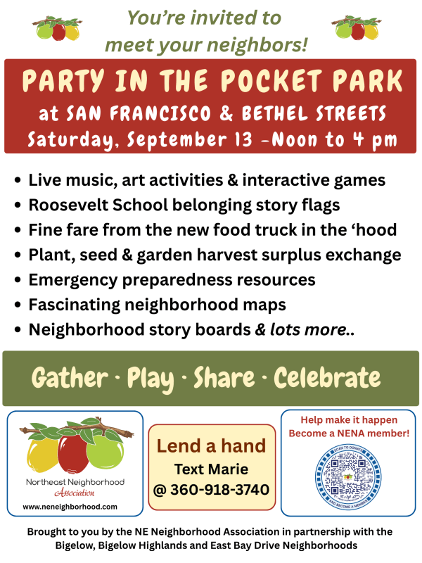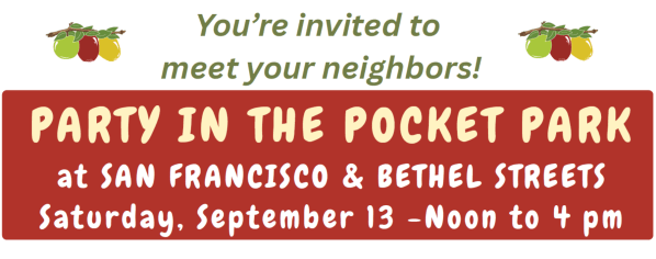 We're throwing a Party in the Pocket Park on Saturday, Sept. 13 from noon to 4 pm to celebrate what makes our great neck of the woods so special! And we need your help. We already have a core group of volunteers for the party, and we need a few more neighbors to lend a hand so... Continue Reading →