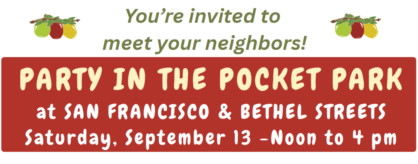 We’re throwing a Party in the Pocket Park on Saturday, Sept. 13 from noon to 4 pm to celebrate what makes our great neck of the woods so special! And we need your help. We already have a core group of volunteers for the party, and we need a few more neighbors to lend a hand so everyone feels welcome and can fully participate. We are also looking for folks to lend us a few 10ft by 10ft or larger tents for the day.